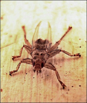De luisvlieg voedt zich met het bloed van zijn gastheer